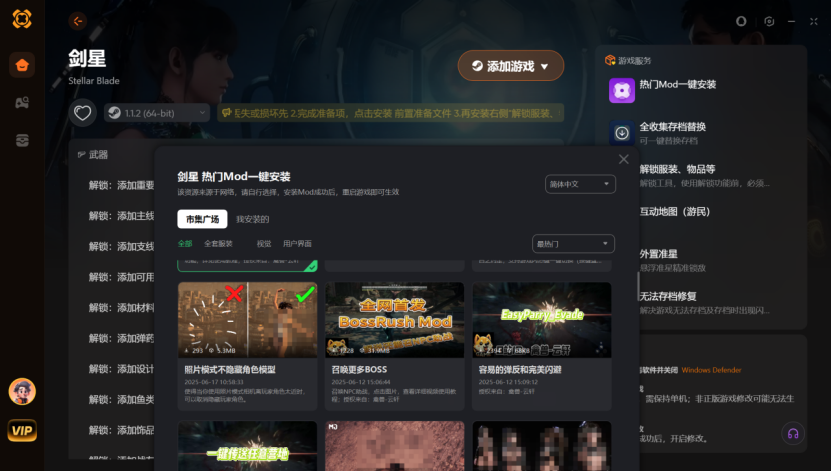 除此之外,XMOD 修改器的剑星热门 mod 合集一键安装功能也十分实用。这些 mod 涵盖了游戏的多个方面,从优化游戏性能,让游戏运行更加流畅的性能优化 mod,到增加游戏剧情,丰富游戏故事线的剧情拓展 mod,应有尽有。一键安装,就能快速为游戏注入新的活力,带来更多的惊喜和乐趣。
