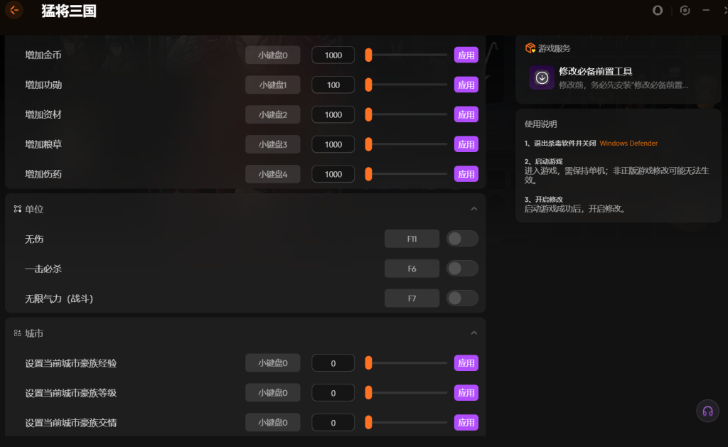 还能使用XMOD修改 器自由的增加金币、功勋、粮草等等的数量,甚至是修改游戏时间以及设置税收、物价的百分比。