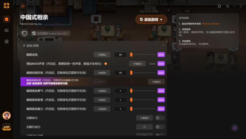 编辑基础体能功能对游戏进程有着重要影响。在游戏里,我们的角色需要四处奔波,处理相亲会所的各项事务,参加各种社交活动,基础体能至关重要。通过 XMOD 修改器编辑基础体能,我们可以让角色拥有更充沛的精力。无论是长时间与客户沟通,还是忙碌地筹备相亲活动,都能轻松应对,大大提高工作效率,为相亲会所的发展注入强大动力。