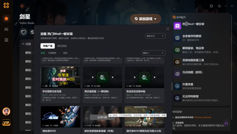 XMOD 修改器的剑星热门 mod 合集一键安装功能,让玩家能够轻松拓展游戏乐趣。在《剑星》的玩家圈子里,mod 一直备受欢迎,因为它们能为游戏注入新的活力。XMOD将众多热门 mod 进行整合,玩家无需再花费大量时间在网络上寻找资源,也不用担心下载的 mod 无法正常使用。只需在 XMOD 中选择心仪的 mod,一键安装,就能快速改变游戏的玩法和风格,让你在熟悉的游戏世界中体验到不一样的乐趣。
