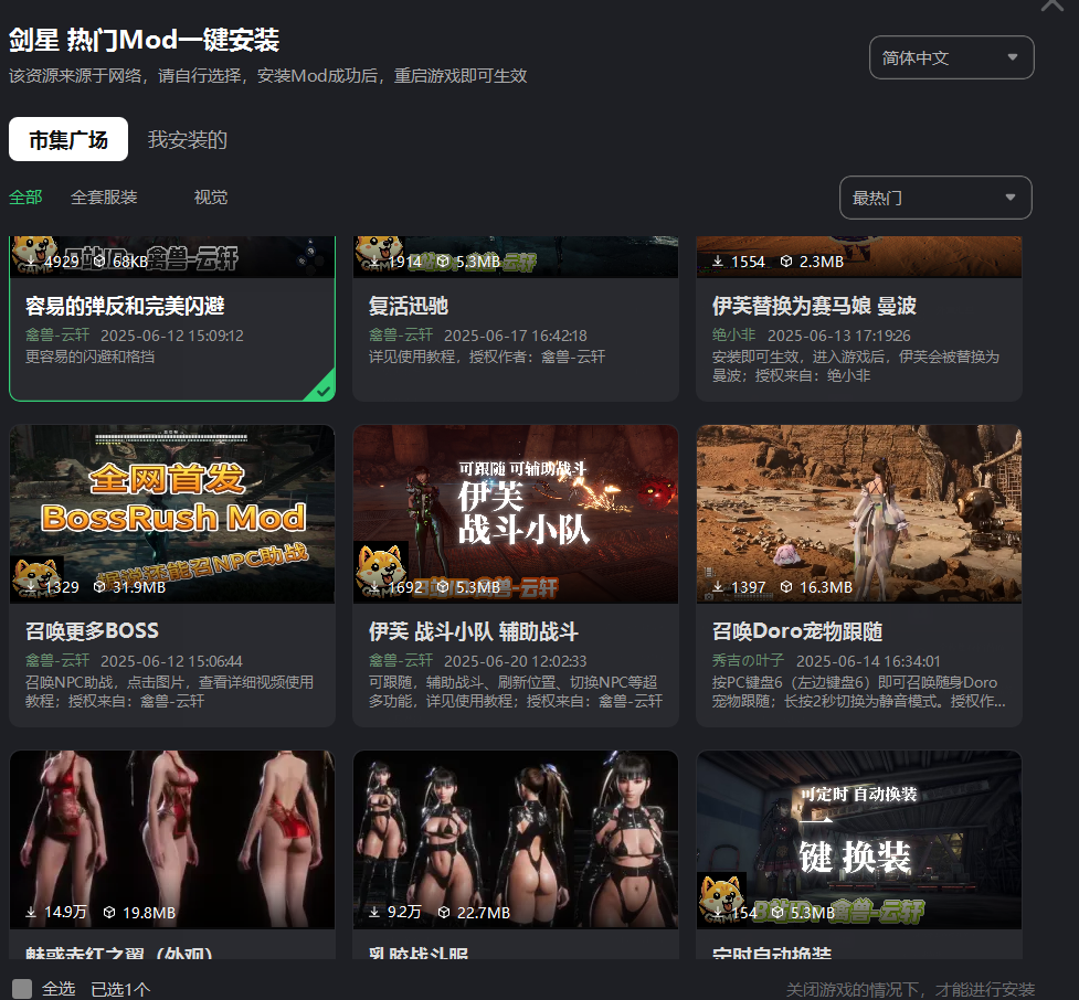 这里提供了容易的弹反和完美的闪避、召唤Doro宠物跟随、伊芙战斗小队辅助战斗以及各类果体mod,大家都能一键安装。