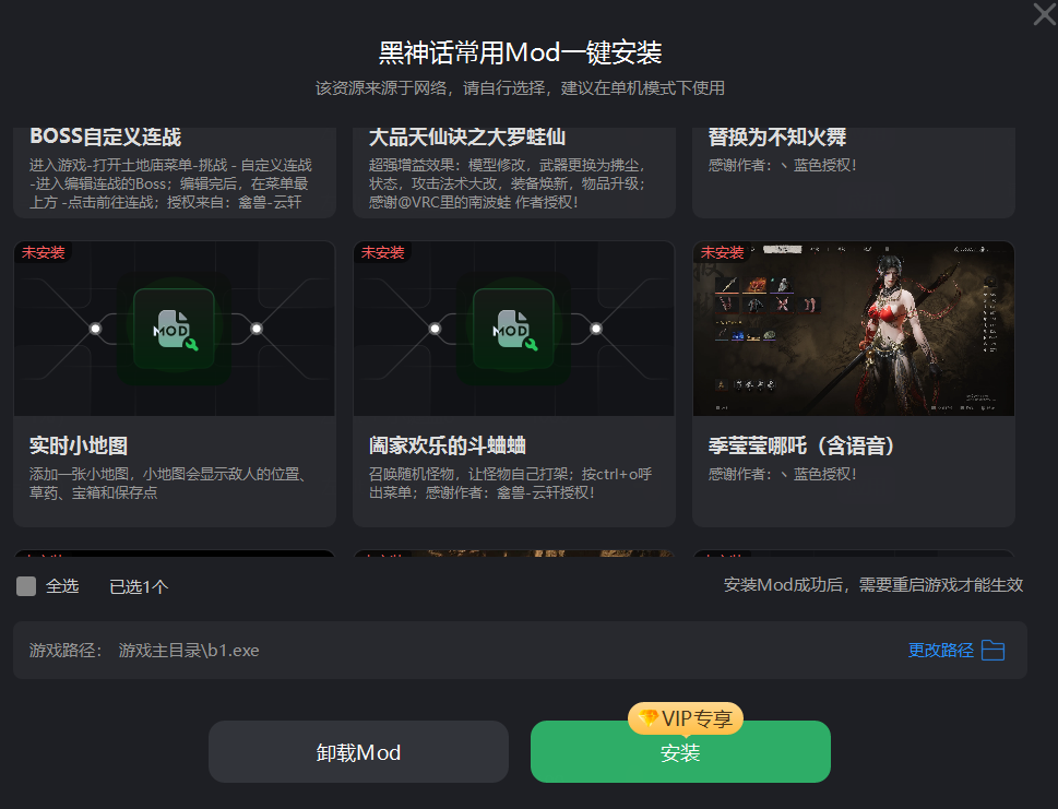 在mod一键安装中为大家准备了大圣完全体、boss自定义连战、实时小地图、阖家欢乐斗蛐蛐等各类深受玩家喜爱的mod。