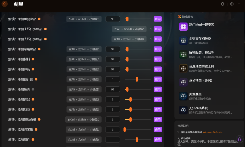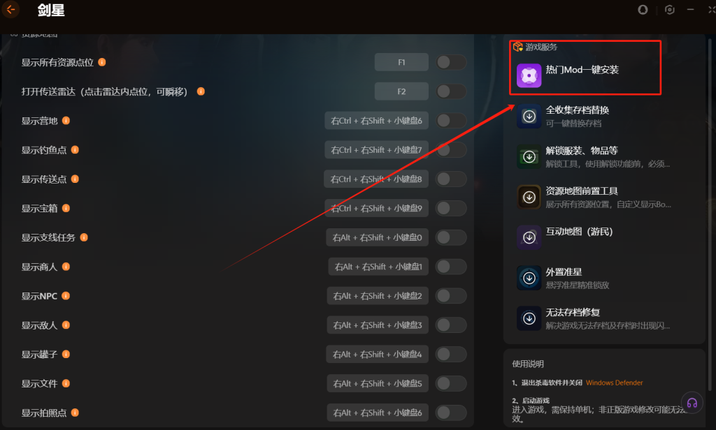 进入到XMOD修改 器中剑星的修改页面之后,大家可以看到在右侧游戏服务中提供了互动地图、全资源存档替换、外置准星工具。