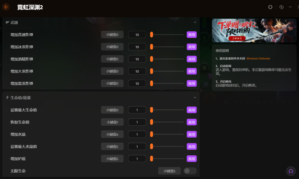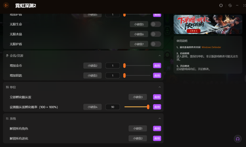 大家可以打开XMOD修改 器搜索霓虹深渊2即可进入到它的修改页面,如果大家电脑已经下载霓虹深渊2之后,只需要关闭安全软件,进入霓虹深渊2即可使用XMOD解锁全部角色与进化,只需要点击应用或者是用快捷键开启即可。