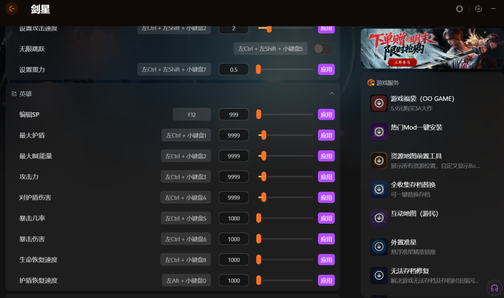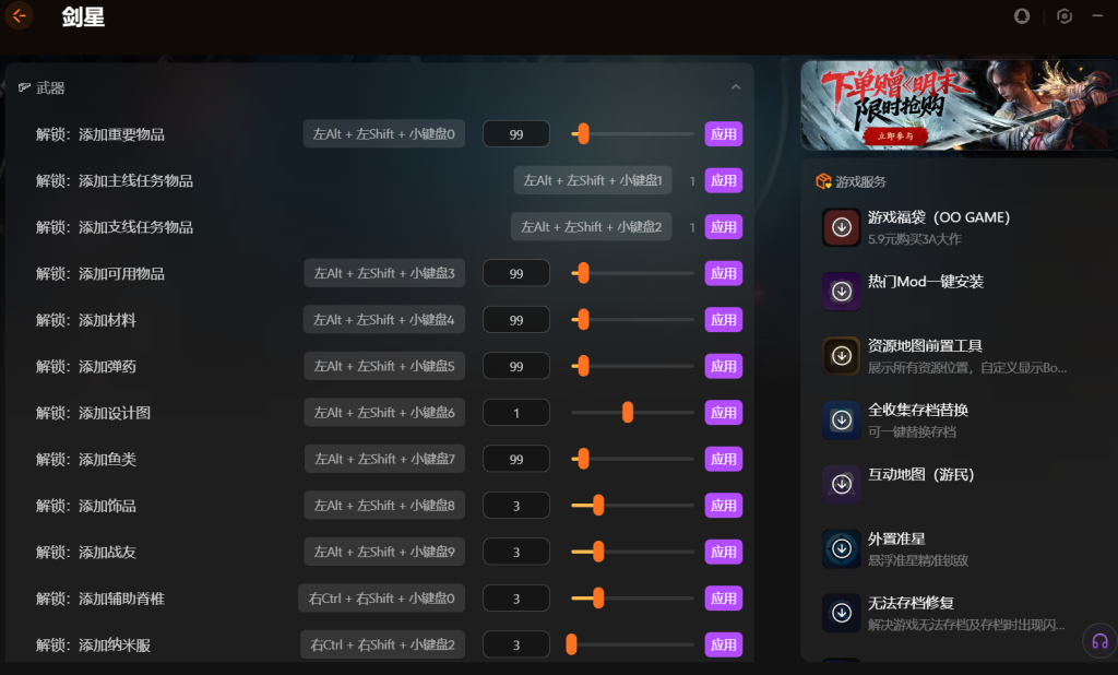 如对于热门的剑星这款游戏,大家可以添加游戏中的所有鱼类、服饰、材料、弹药以及解锁所有物品。