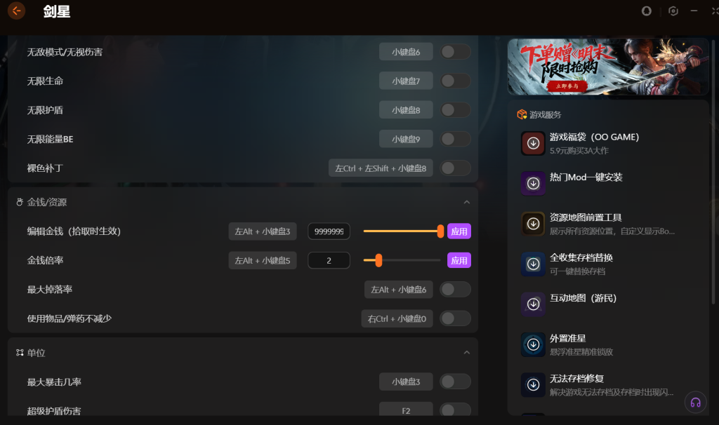 还能开启无限生命、无限无限能量BE以及编辑金钱和设置金钱概率,开启最大掉落率。