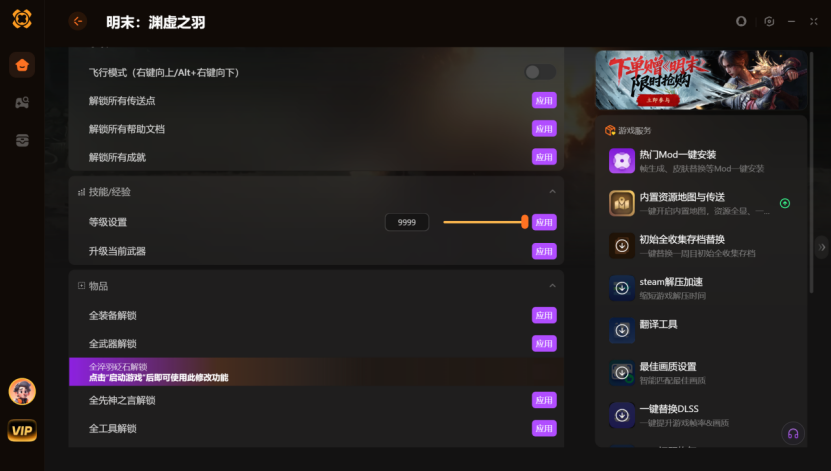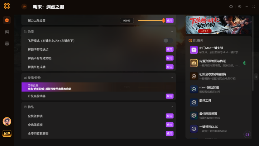 玩《明末:渊虚之羽》时,最纠结的是 “成长节奏”—— 类魂玩法的高难度让升级变慢,有时候卡关一周,等级还没提升多少,更别说解锁新技能了。而且游戏里的服装道具藏得特别深,错过一步就得从头再来,好在 XMOD 修改器帮我解决了这个问题。​