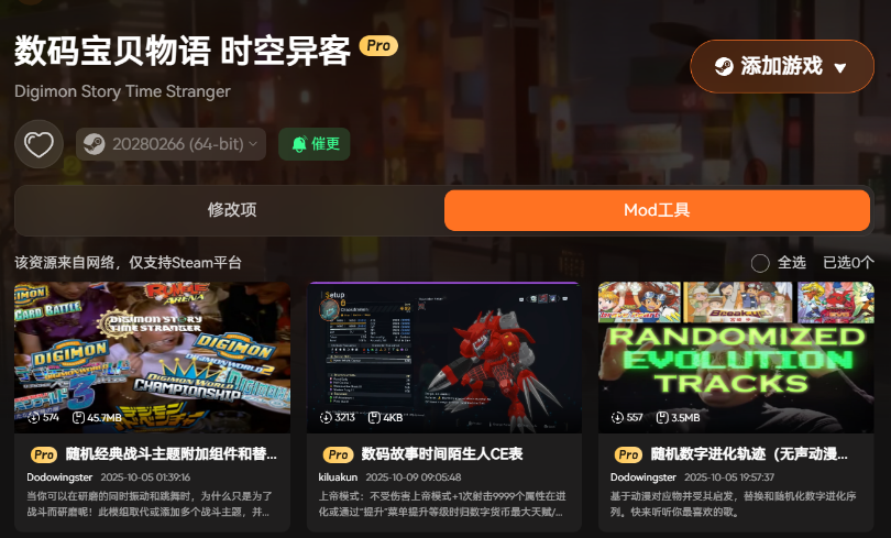 热门 MOD 对于丰富《数码宝贝物语时空异客》的玩法有着重要作用,无论是想要让数码宝贝外观更独特,还是想体验新的剧情内容、调整战斗难度,合适的 MOD 都能满足需求。但手动寻找和安装 MOD 不仅耗费时间,还容易出现安装错误导致游戏无法正常运行的问题。XMOD 修改器的热门 MOD 一键安装功能就很好地解决了这个难题,玩家只需在修改器中选择想要的 MOD,点击安装就能完成,全程简单便捷,无需担心技术问题。