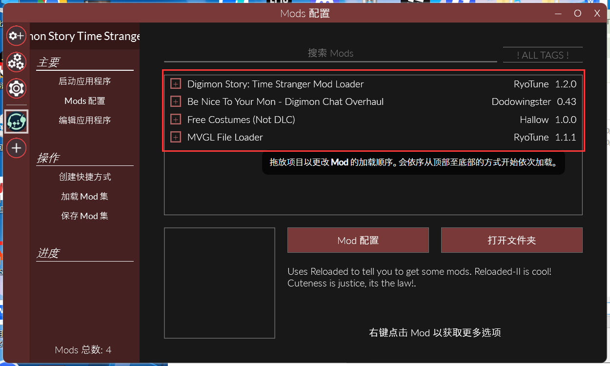 使用教程 Mod安装教程 13 10 月, 202513 10 月, 2025 由于游戏前置安装较为复杂,无法一步到位,所以使用教程的形式进行mod安装 1.安装前置mod安装器>>点击下载 2.启动程序,等待安装结束 3.点击【添加应用程序】 4.前往游戏根目录,找到游戏的应用程序 5.找到并添加应用程序 6.之后即可将游戏mod添加到加载器中 注意,请将【Mod Loader】始终放置在最上方,否则mod将不生效 mod下载地址: Mod Loader>>点击下载