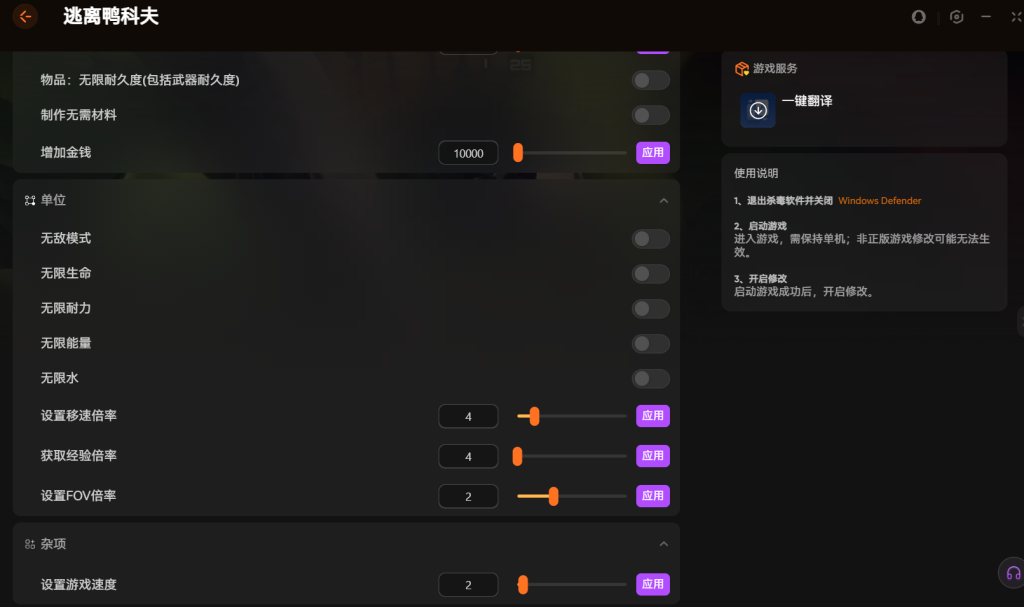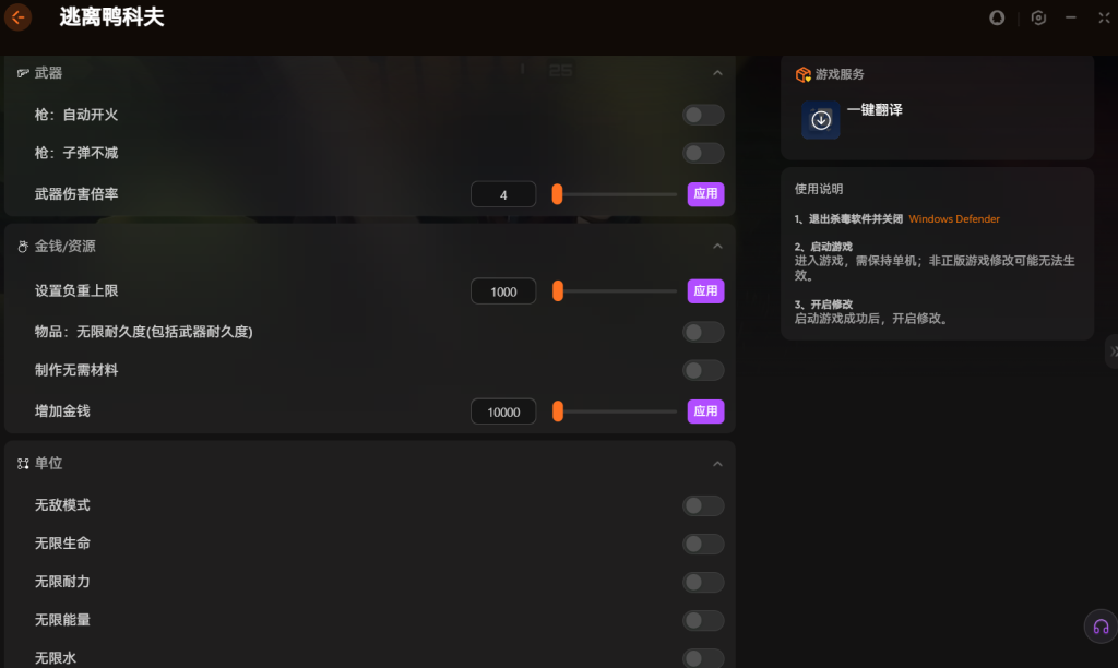 使用XMOD修改 器前请退出杀毒软件。进入游戏后保持单机状态,然后开启修改功能。这些实用功能将大幅提升你的游戏体验,帮助你在鸭科夫世界顺利生存。