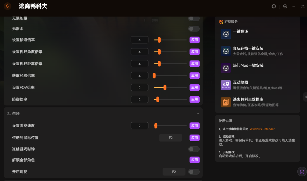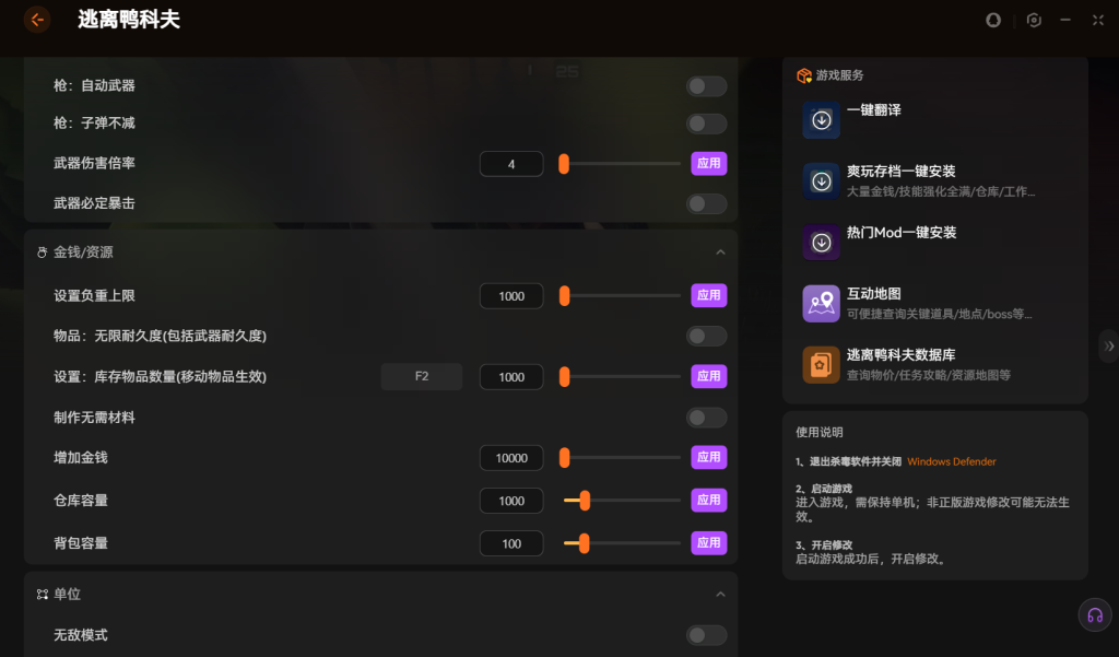 xmod修改 器为逃离鸭科夫提供了丰富的功能支持。你可以一键获得无限金钱和满级技能。背包负重和物品耐久也能轻松调整。
