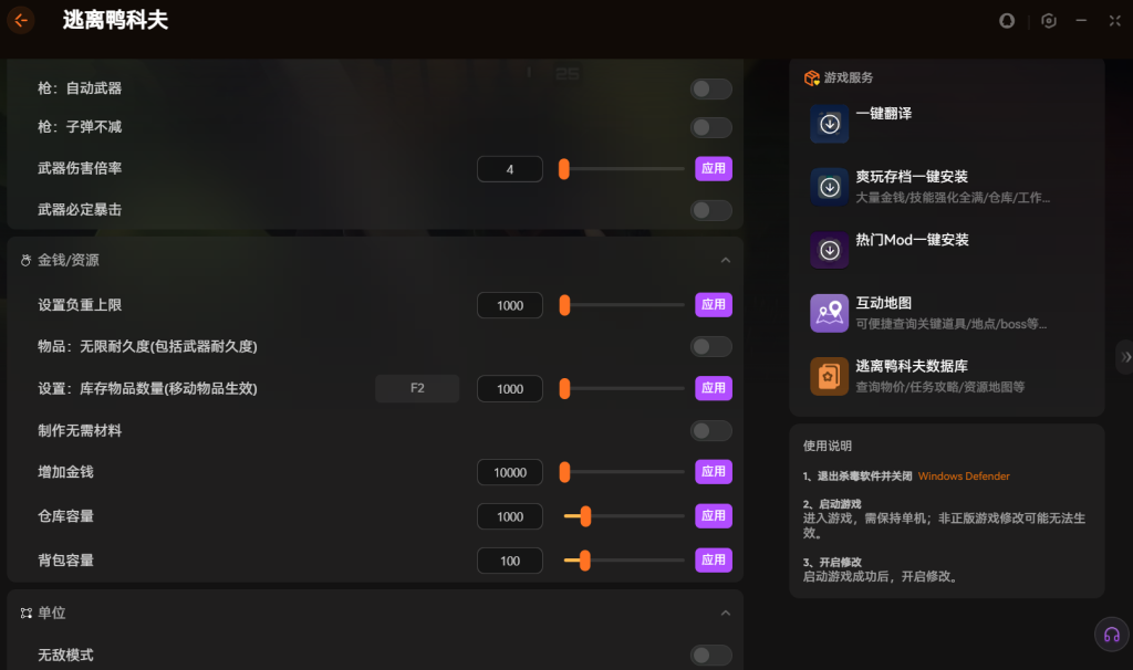 XMOD修改 器为你提供全面游戏辅助。自动武器子弹无限且伤害翻倍。资源方面金钱可自定义负重无限制。制作无需材料背包仓库容量都能调整。