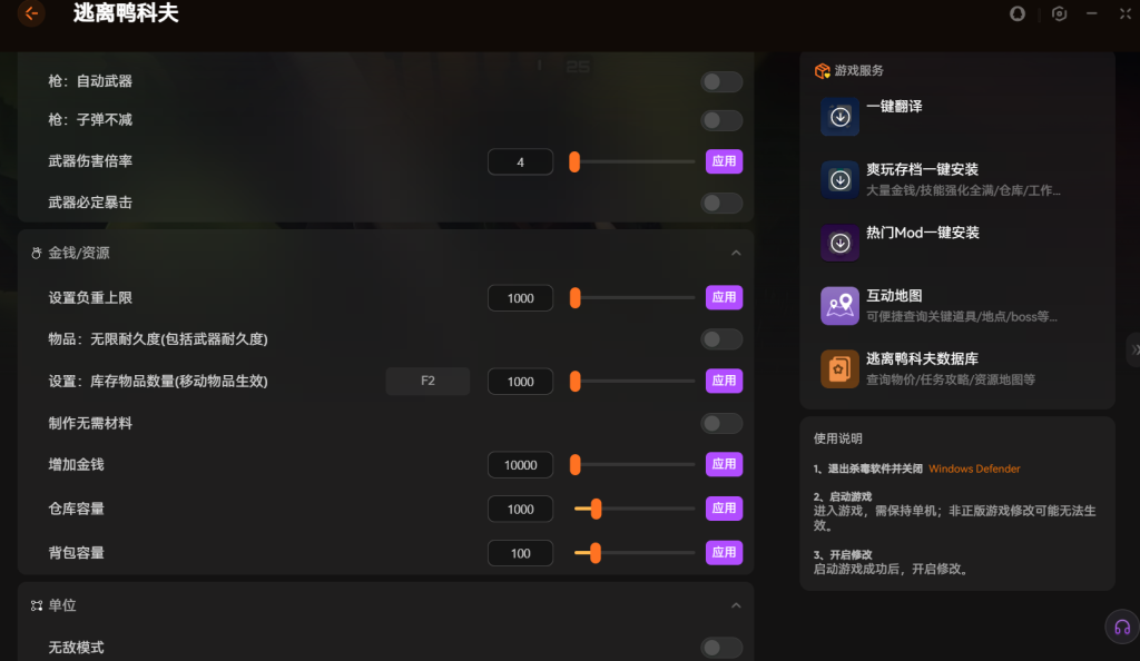 XMOD还能修改游戏参数比如背包容量和仓库容量。你可以设置负重上限不用担心超重。制作物品也可以无需材料节省很多时间。