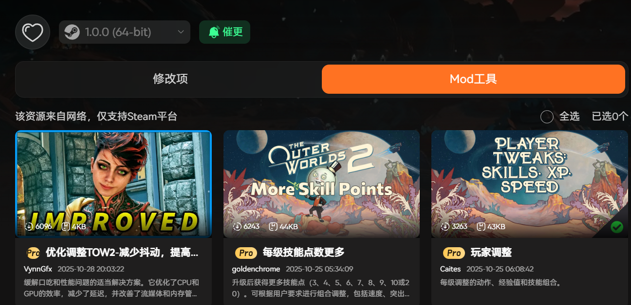 对于喜欢折腾 mod 的玩家来说,XMOD 的热门 mod 一键安装功能也很实用。《天外世界 2》的 mod 社区很活跃,有不少能提升游戏体验的内容,比如优化的、但手动安装不仅要注意 mod 版本和游戏版本匹配,还要处理加载顺序,稍微出错就可能导致游戏崩溃。而 XMOD 里的热门 mod 列表都是经过筛选的,适配性有保障,点击 “一键安装” 后不用管后续操作,修改器会自动完成部署。