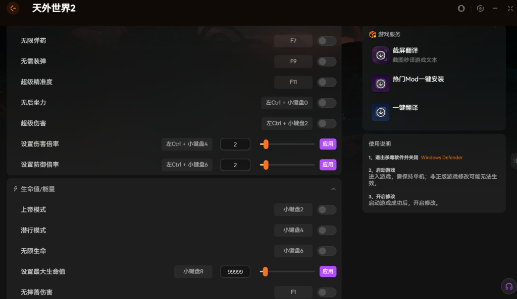 使用前记得先关闭系统防护软件。启动游戏后再打开修改器。建议在单机模式下使用。这样效果最稳定。游戏更新后记得检查兼容性。