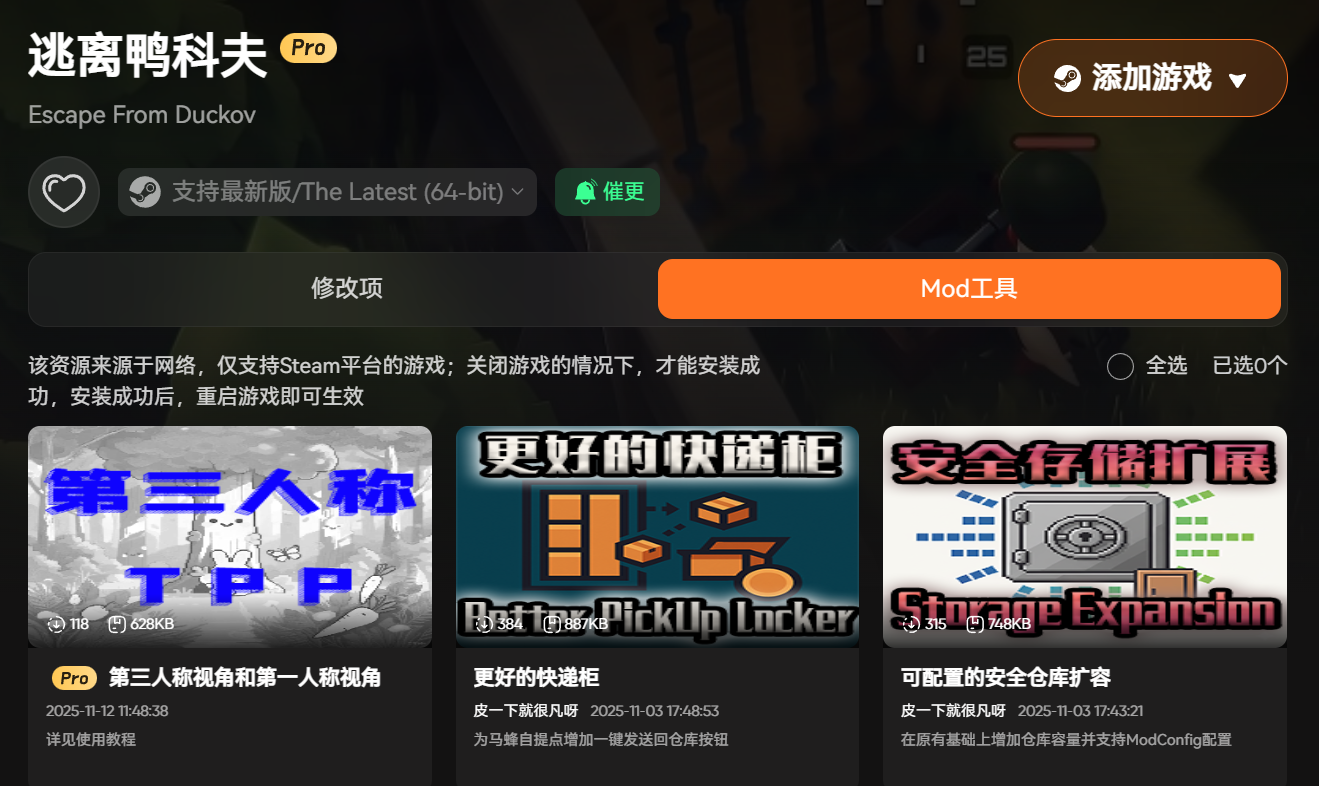 《逃离鸭科夫》是以搜打撤为核心的萌系生存游戏,玩家化身打工鸭在五张随机地图中搜刮物资、改装武器、建设基地,还要在危机四伏的环境中找到撤离点才能保住收获。不过玩久了会发现,找热门mod要翻遍论坛,探索时还总担心子弹突然耗尽,直到我用了XMOD修改器,这些问题都解决了,这篇就说说实用功能。