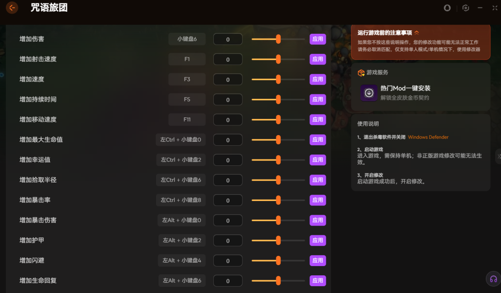 这个XMOD专门为单机模式设计。使用前记得关闭杀毒软件。先启动游戏再打开修改功能。操作起来非常方便。