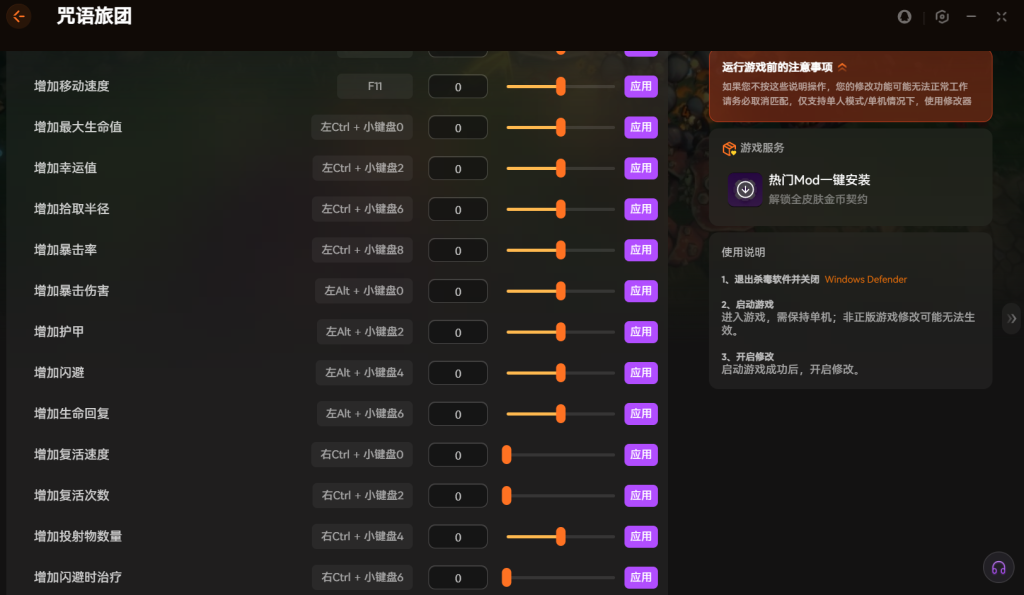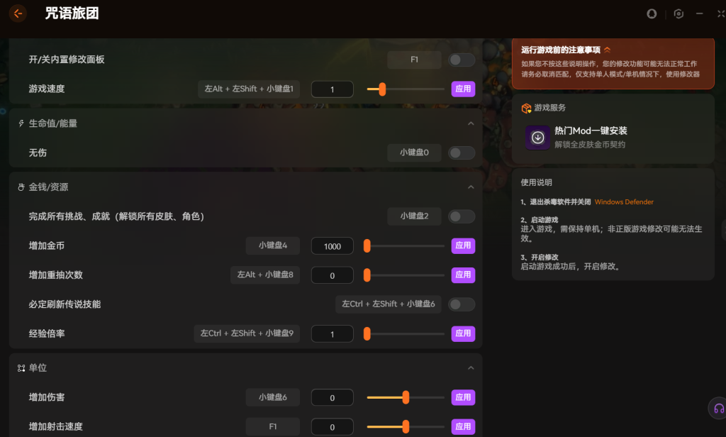 使用前请确保游戏处于单人模式。并按照说明关闭相关防护软件。启动游戏后再开启修改功能。这样才能保证各项修改正常生效。