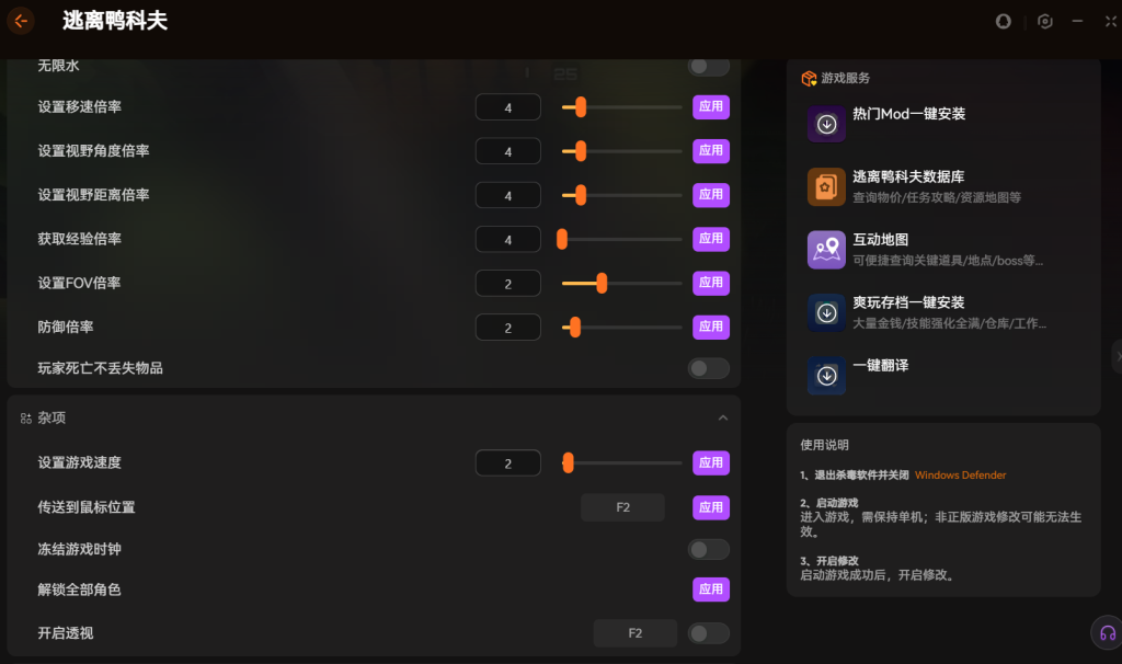 使用前请确保关闭安全软件。启动游戏进入单机模式后再开启修改。非正版游戏可能无法正常使用。建议在离线状态下运行以获得最佳效果。