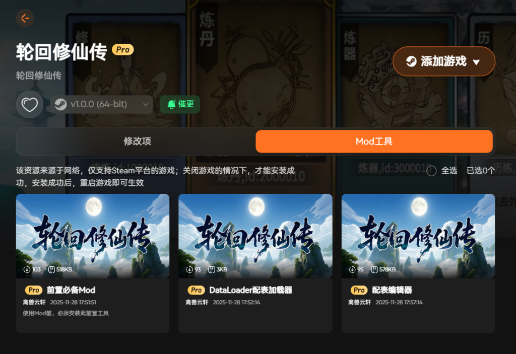 软件还集成了热门Mod一键安装功能。你可以方便地为游戏添加新内容,提升游戏体验。同时提供一键翻译服务,支持菜单和文本的汉化。