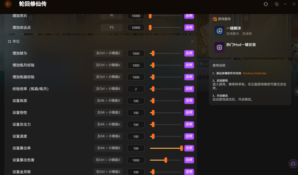 使用前记得退出安全软件。先正常启动游戏进入单机模式。然后再打开修 改器应用功能。操作步骤很简单,按说明来就行。