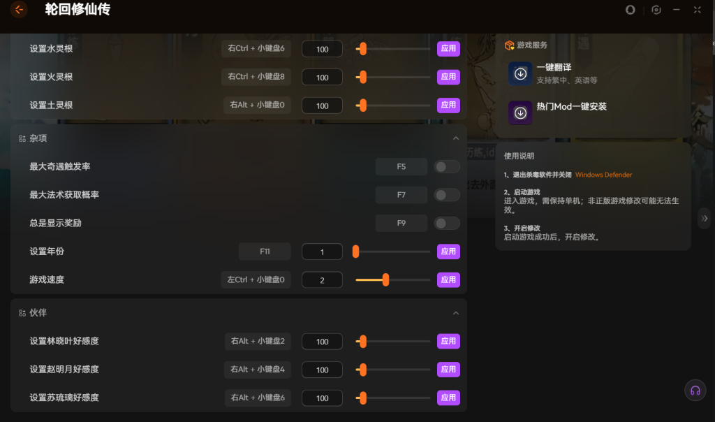 游戏里的奇遇和法术获取也能调整。触发概率可以调到最大。年份和游戏速度也能控制。这样你可以更自由地体验游戏内容。
