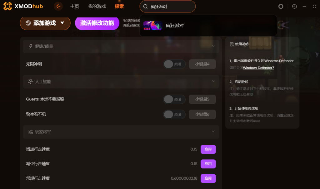 疯狂派对这款游戏的设定很有趣,大家可以看到整个派对地图上每个人的位置,玩家需要避免被警察发现你的行为。但是玩家在体验后续关卡的时候会发现难度很高,这时候大家可以使用免费的XMOD修改器来修改游戏数值,XMOD修改器可以修改4000余款到单机数值,下面你们可以跟着小编一起来看看疯狂派对免费修改器下载方法 疯狂派对修改器介绍。
