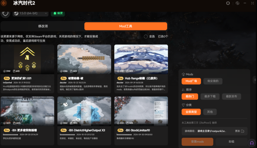 平台还集成了热门MOD的一键安装功能。这些MOD能带来更多游戏内容或界面优化。使用前记得先关闭系统相关防护软件。启动游戏后请确保处于单机模式再开启修改。
