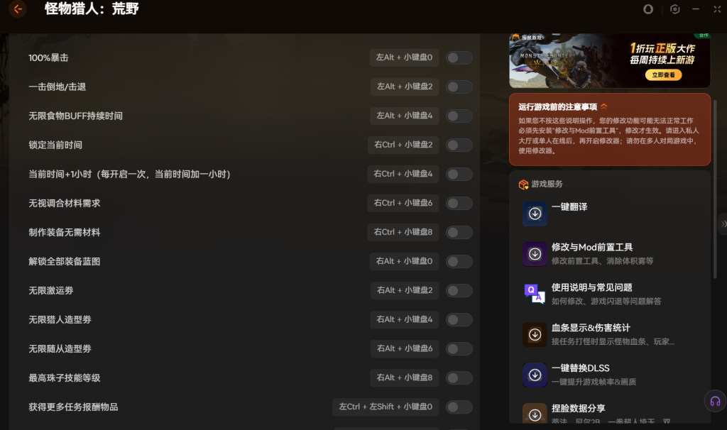 XMOD修改 器也提供了丰富的资源管理选项。比如获得无限公会点数,或是让道具袋和弹药袋的数量用不完。这些都能让你更专注于狩猎的乐趣本身。