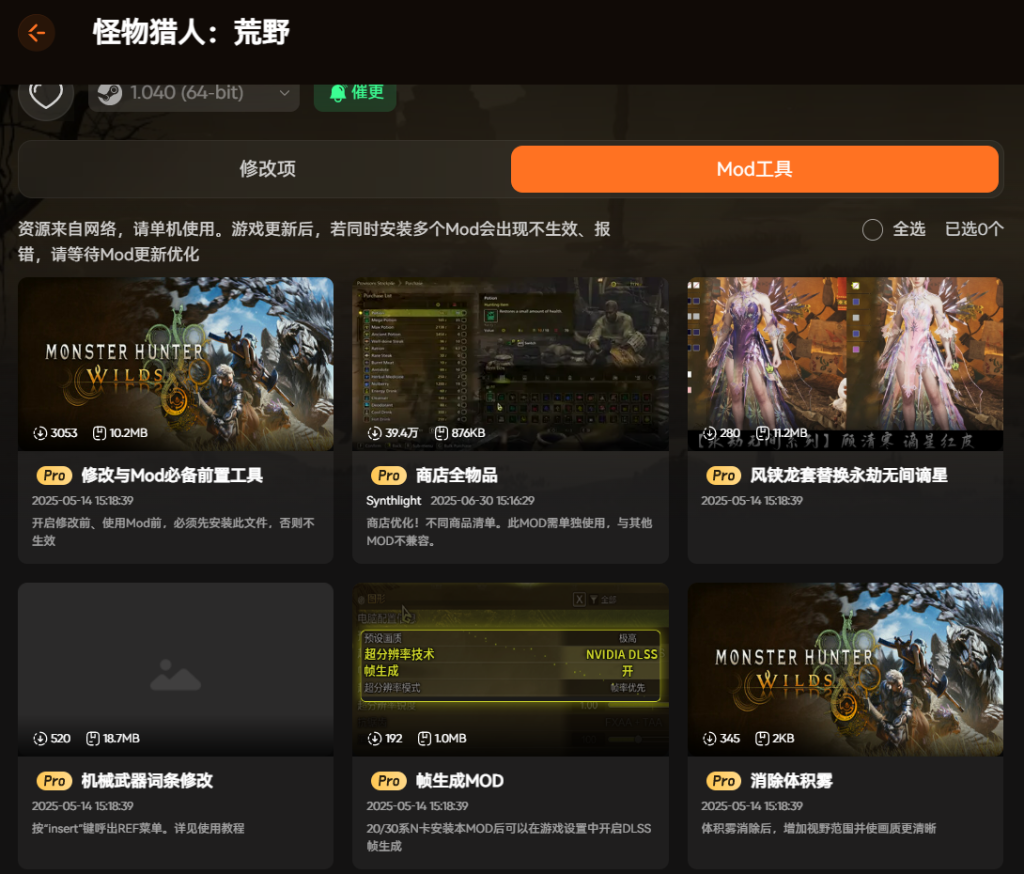 软件同样支持各种MOD拓展。你可以安装前置工具来使用更多玩家制作的MOD,比如替换炫酷的装备外观。让游戏体验变得更加个性化。
