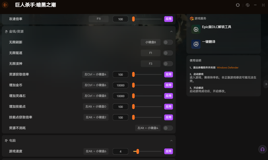 使用前记得按照说明退出安全软件。启动游戏进入单机模式后再开启修改功能,以确保各项修改正常生效。