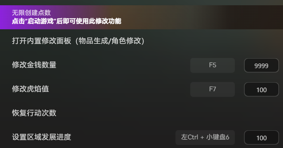 我最常用的是恢复行动次数和修改虎焰值这两个功能。游戏里大地图回合制玩法中,行动次数有限制,往往刚部署完据点发展,就没次数去招贤纳士或探查情报,错失扩张时机。有了恢复行动次数功能,能灵活规划每回合操作,既能稳步发展据点,又能主动和其他门派周旋,真正实现“上兵伐谋”。而虎焰值关系到门派声望和特殊功法解锁,后期提升极慢,修改后能快速解锁强力功法,让虎焰门迅速崛起,不用再慢慢熬声望。