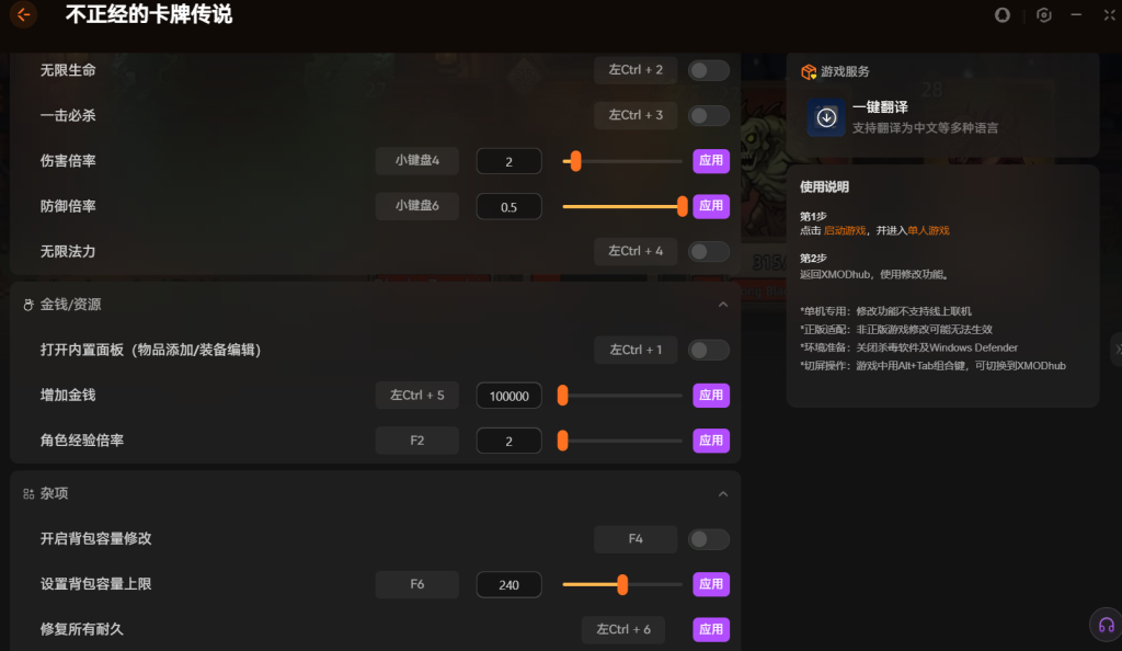 这个修改 器专为单机设计。使用前记得先关闭杀毒软件。在游戏中按快捷键就能随时切换修改面板,操作上没什么难度。