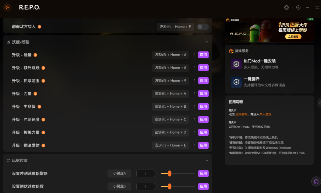 使用起来也挺简单。先正常启动游戏进入单人模式,然后切出来在XMOD里选择需要的功能应用就行。不过要注意,修改功能主要用于单机,线上联机并不支持,这也是为了避免影响其他玩家的体验。
