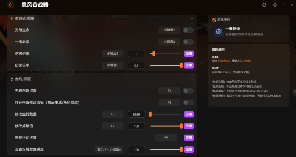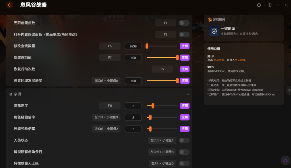 使用前记得先启动游戏并进入单人模式。然后切换出来运行修改 器就能生效了。它主要服务于单机内容,线上模式是无法使用的。建议提前关闭系统的安全软件以避免误拦。