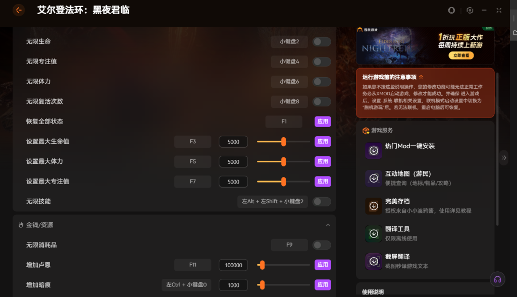 艾尔登法环:黑夜君临修改器推荐 支持设置最大体力+最大专注值