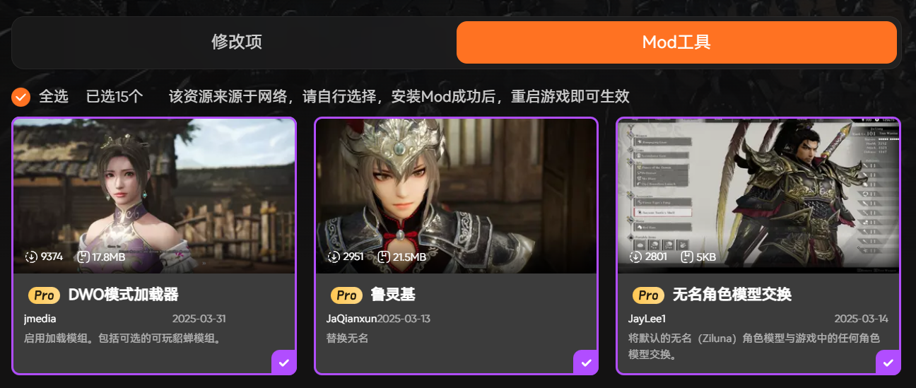 最实用的还是XMOD的热门mod一键安装功能,不用自己找资源、改文件,不管是画质优化mod、武将外观mod还是战场音效mod,点开就能快速安装,适配即将发售的DLC,不用操心兼容性问题。对于不擅长手动操作的玩家来说,省去了很多麻烦,不用再因为安装mod出错导致游戏崩溃,之前用其他工具就经常遇到这种问题,XMOD在这方面做得很稳妥。