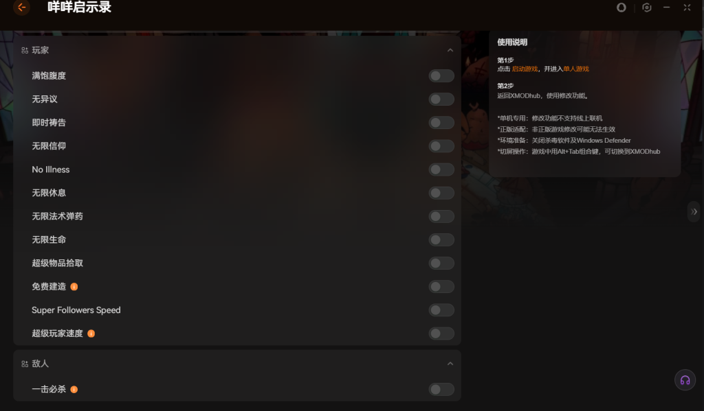 注意修改 器仅支持单人模式,联机不能用。建议正版用户使用,兼容性更好。想轻松玩咩咩启示录的话,这款XMOD修改器值得一试。
