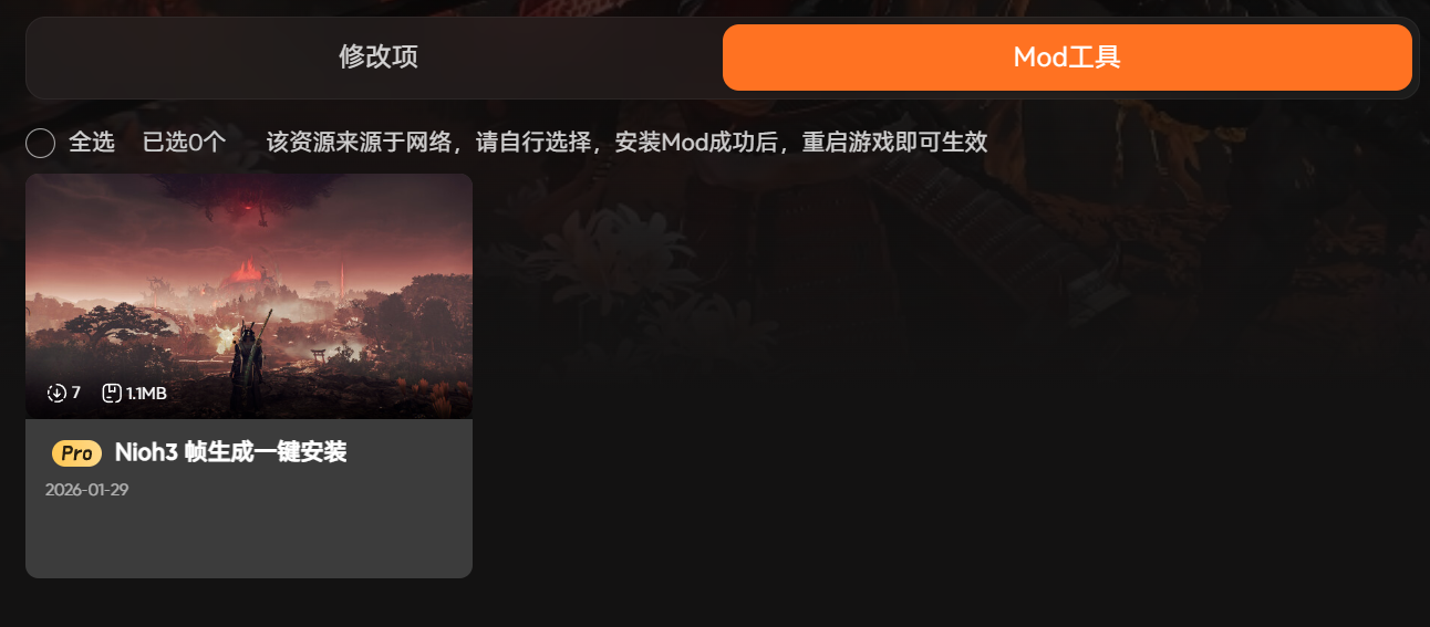 第二个是帧生成mod一键安装,demo里有些场景掉帧严重,尤其是妖怪扎堆的时候,画面卡顿直接影响操作,一键安装后帧率稳得一批,每一次闪避和攻击都特别丝滑,战斗体验提升太多了。