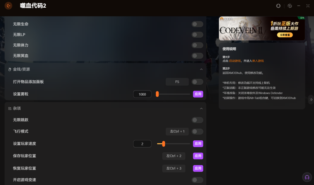 今天就为大家介绍一款实用的噬血代码2修改 器——XMOD修改 器。它针对这款游戏开发,功能强大且操作简单。修改器支持无限跳跃和飞行模式,能帮你跨越地形障碍,自由探索地图。