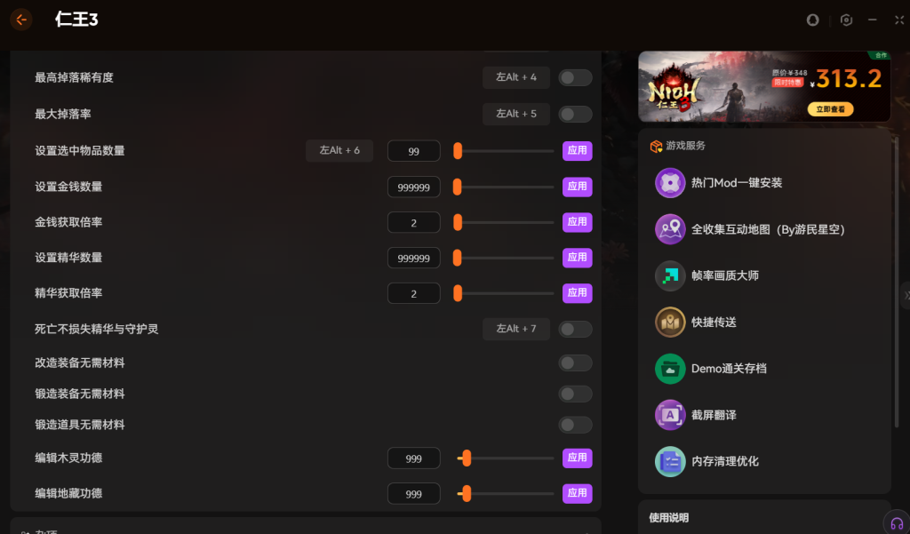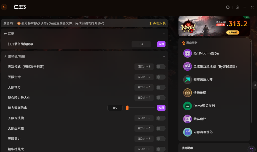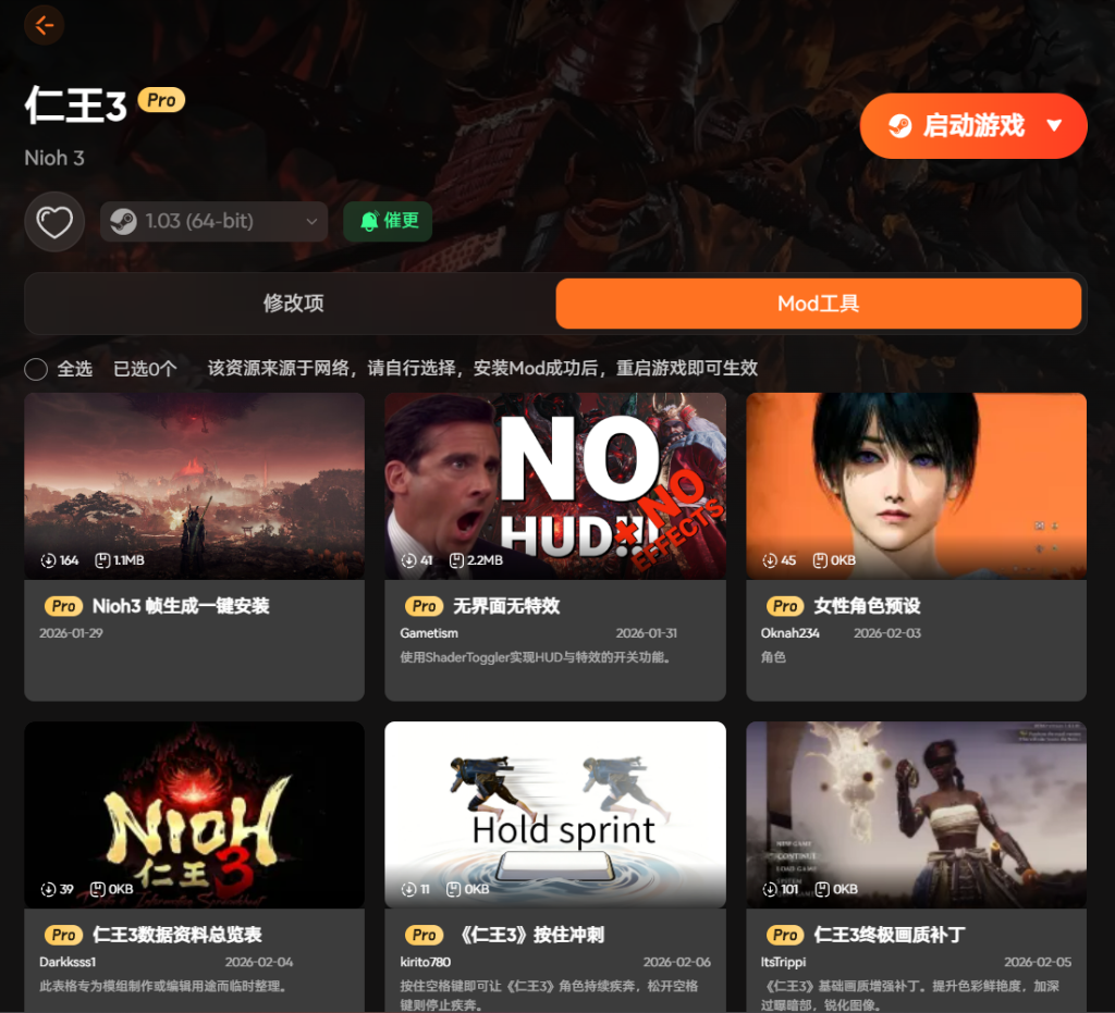这款修改器还支持热门 mod 一键安装,比如画质补丁、角色预设,和修改器功能互补,让仁王 3玩法更丰富,新手也能扛住高难度。