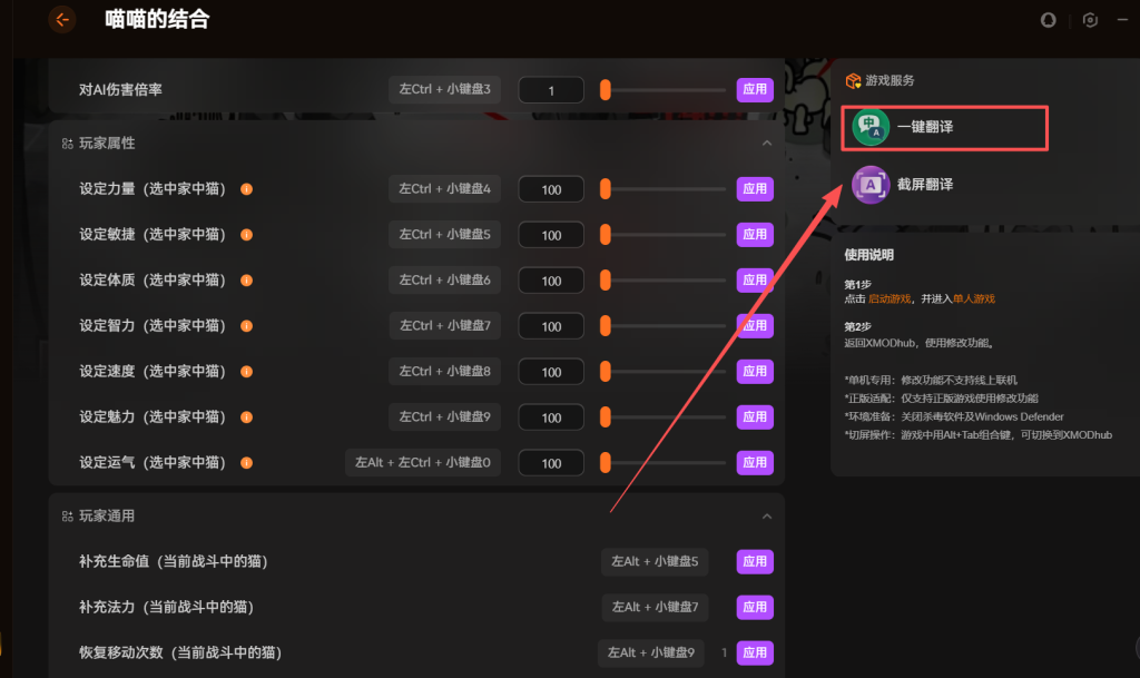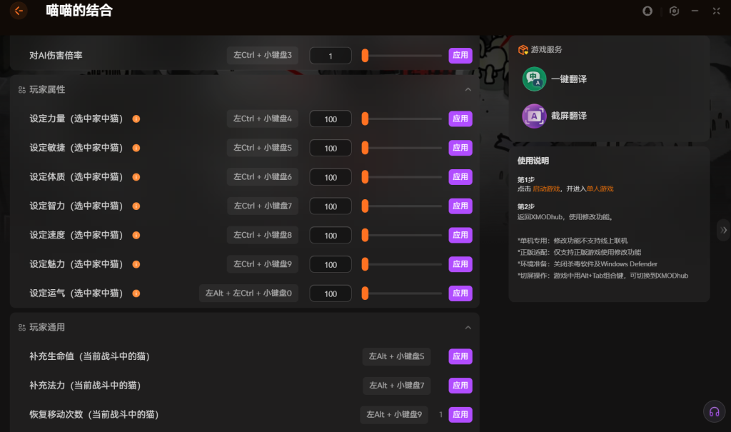 除了汉化,修改器的功能也很实用。可以直接设定猫咪的力量、敏捷、体质等属性,数值拉满也没问题。战斗时还能补充生命值和法力值,不用频繁回城补给。