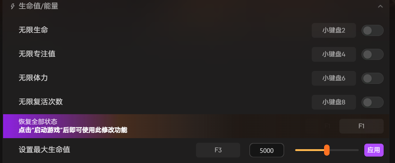 XMOD 的恢复全部状态功能真的很实用,游戏中角色在战斗后往往会损失大量生命值、专注值,还可能陷入中毒等负面状态,回城恢复不仅浪费时间,还可能错过一些探索机会。开启恢复全部状态功能后,玩家可以随时一键恢复角色的所有状态,包括生命值、专注值满格,解除所有负面效果,不用再回城,直接继续探索或战斗,大大提升了游戏节奏,让玩家能把更多精力放在核心玩法上。