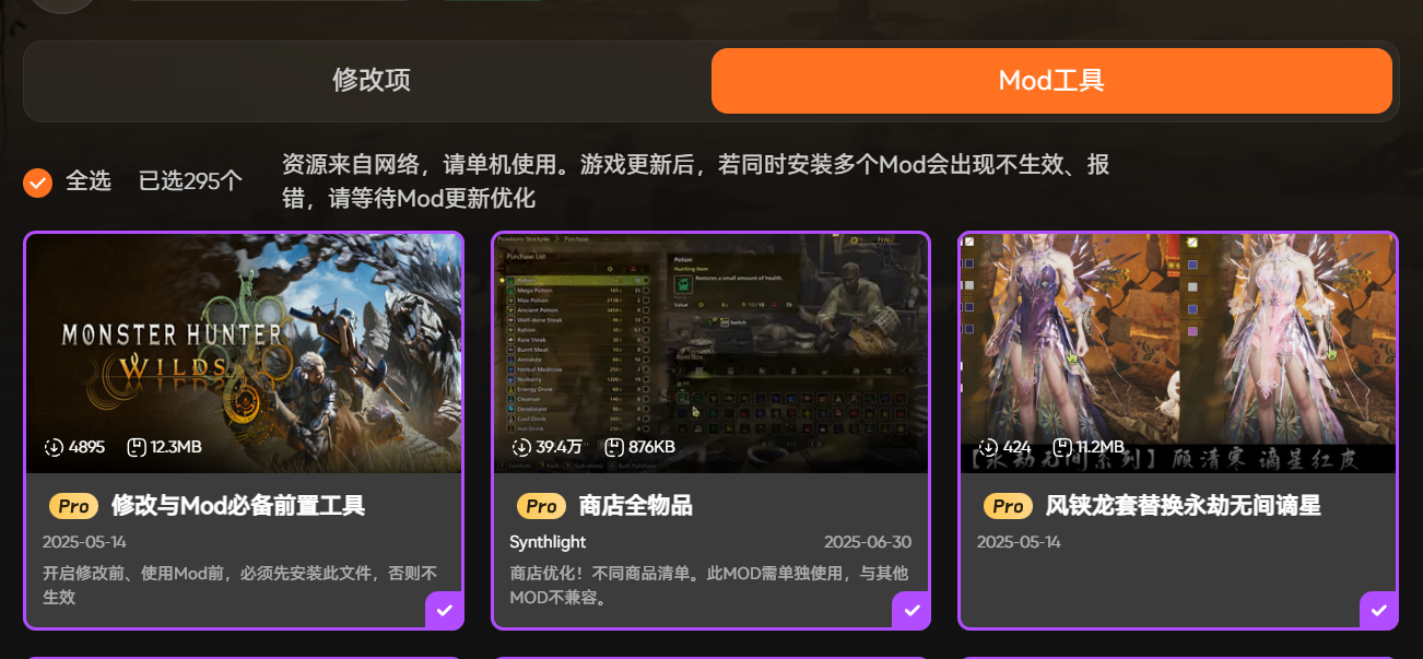 XMOD的热门mod一键安装功能覆盖了新版本的主流mod类型,不管是需要的素材采集辅助mod,还是优化战斗体验的mod,都能在软件内直接搜索找到。我安装新版本的武器外观mod时,不用自己找资源链接,也不用手动替换游戏文件,在XMOD里选择对应的mod,点击安装就能完成,整个过程不到五分钟。而且安装后运行稳定,没有出现游戏崩溃或画面异常的情况。