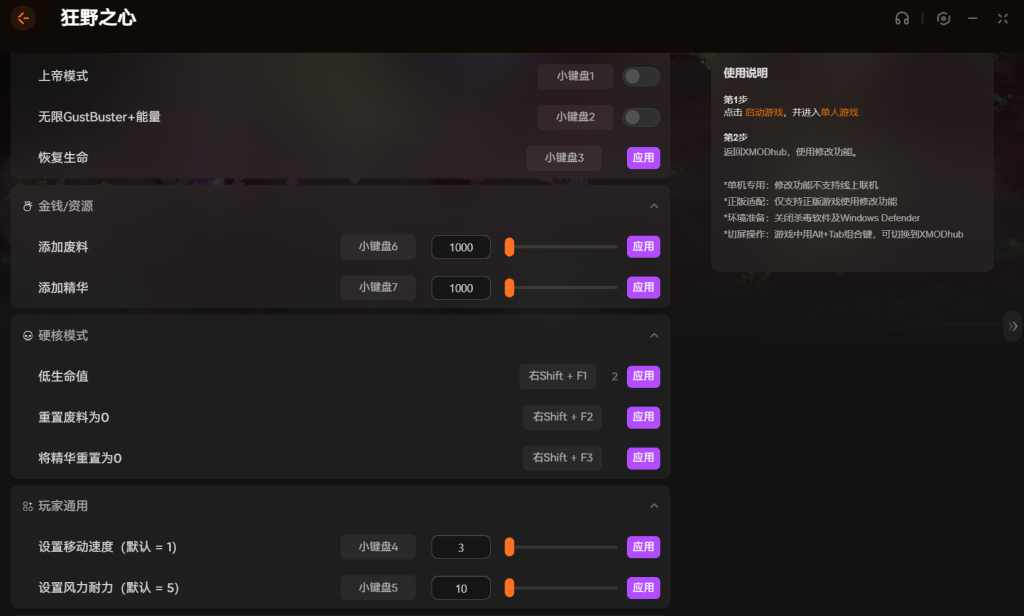 这个修改 器用起来很简单。先启动游戏进到单人模式,然后切出来打开XMODhub,点一下应用就行。操作挺直接的,不用折腾复杂的设置。修改器是针对正版做的,支持Steam版本。
