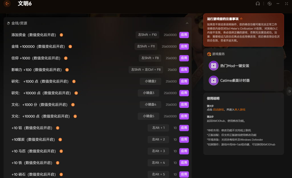 打开XMOD,进入游戏后按左Shift+F10就能调出金钱修改,想加影响力就按左Shift+左Ctrl+F8。数值变化后开启,等个回合就能生效。不用退游戏切来切去,特别方便。
