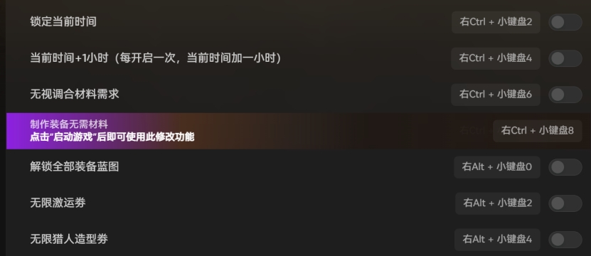 如图所示,这款修改器最吸引人的就是制作装备无需材料、解锁全部装备蓝图两大功能,彻底告别刷素材的肝度困扰。无论是一周年限定的盛装α系列装备,还是联动专属的随从饰品,无需反复狩猎刷取材料,一键解锁就能直接穿戴,轻松打造毕业套装。