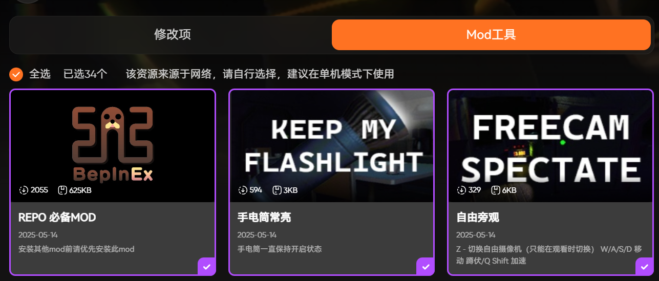 它的mod一键安装功能也能帮新手快速提升游戏体验。repo有很多适合新手的mod,比如有的mod能降低抓取工具的操作难度,让新手更容易精准抓取物品;有的mod能显示怪物的刷新预警,给新手足够的反应时间;还有的mod能增加新手引导提示,帮助新手快速熟悉游戏机制。但手动安装这些mod对新手来说门槛很高,要找对版本还要设置路径。XMOD整合了这些新手友好型mod,直接在修改器内就能选择,点击“一键安装”就能自动完成所有步骤,不用手动干预,安装完成后就能直接体验,让新手更快适应游戏节奏。