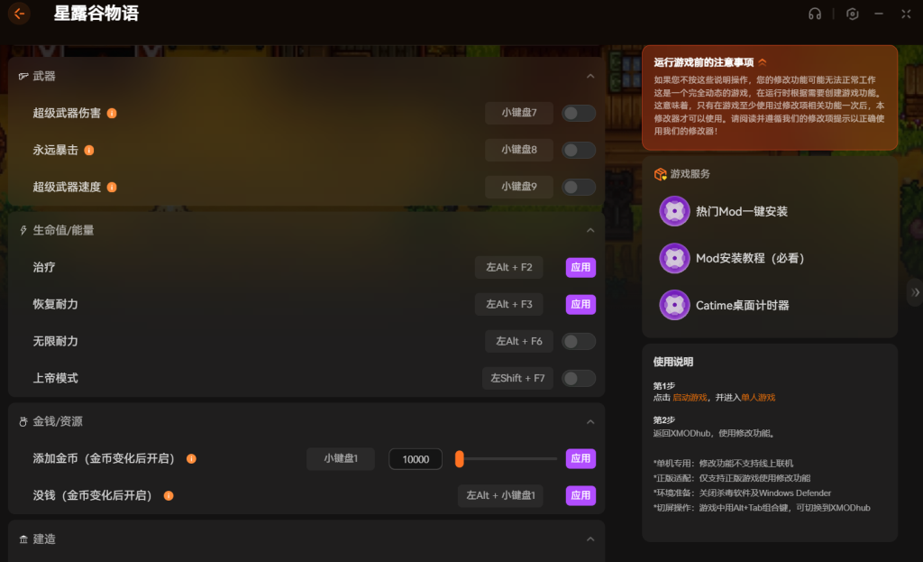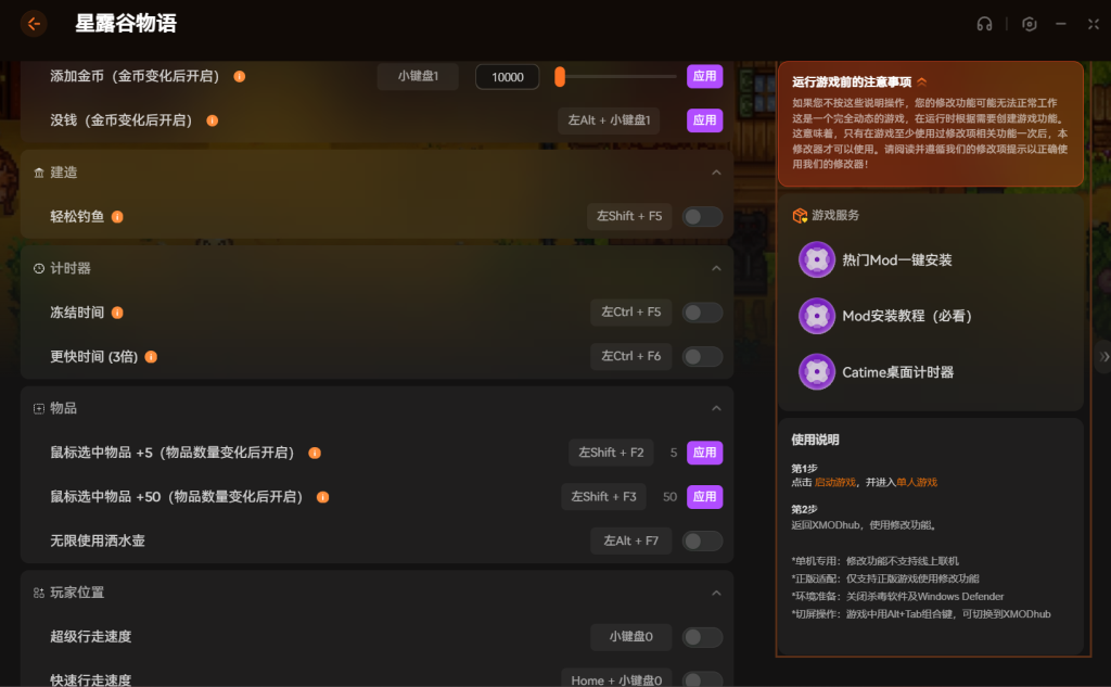 XMOD用起来也简单,图片上的说明很清楚。先点启动游戏进单人模式,然后切回修改器按对应键位就行 。无限耐力是左Shift+F7,更快时间是左Ctrl+F6,记不住也没事,界面都写着。想好好体验星露谷又不想太累,这工具确实省心。