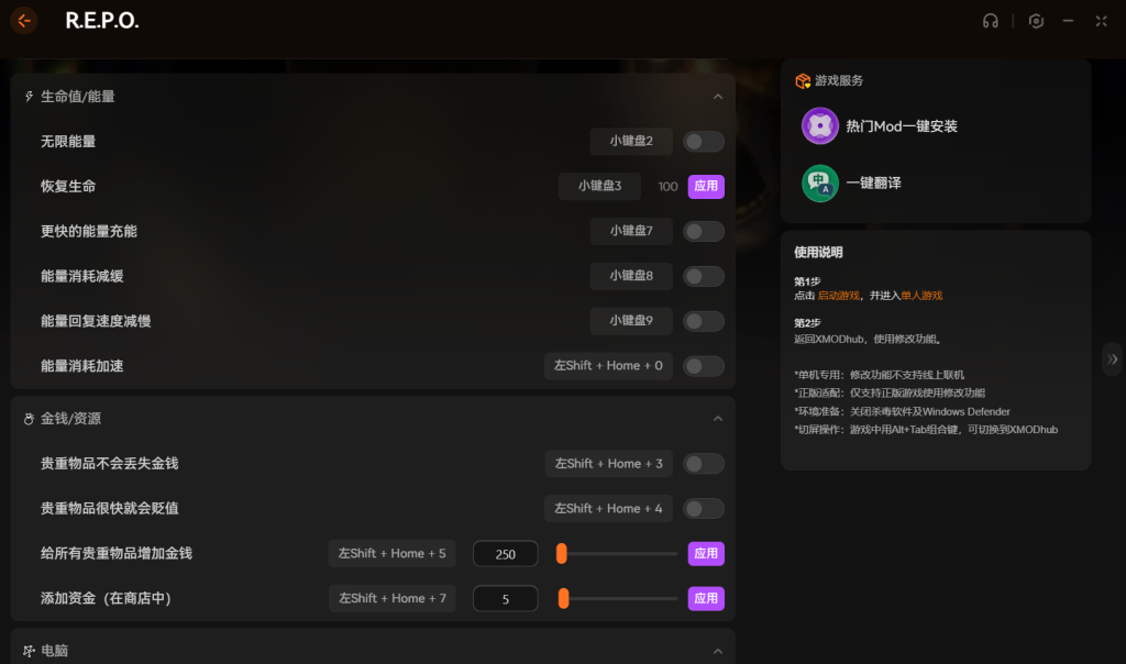 XMOD还带热门Mod一键安装。Repo这游戏Mod不少,有手电筒常亮的,有自由旁观视角的,还有增加联机人数的。不用自己到处找文件,修改器里直接点一下就装好了。